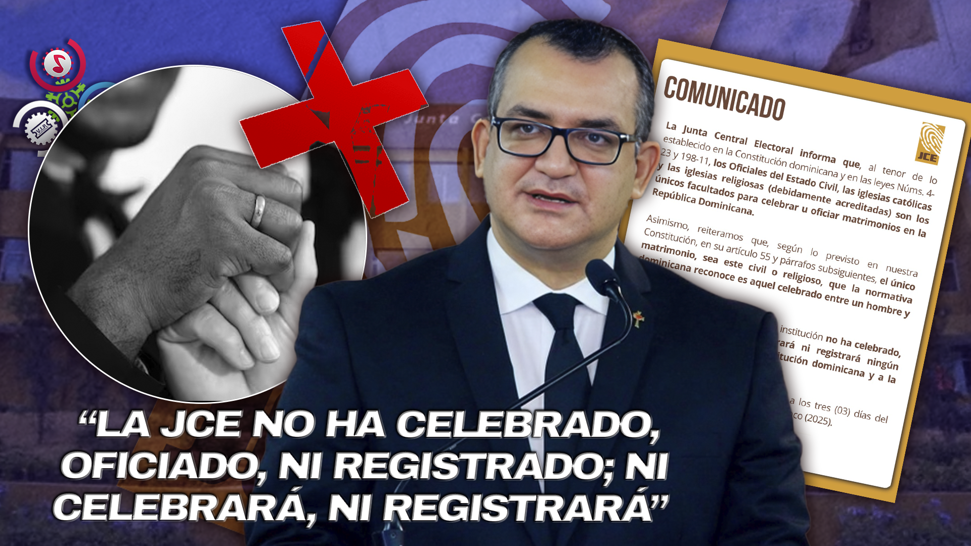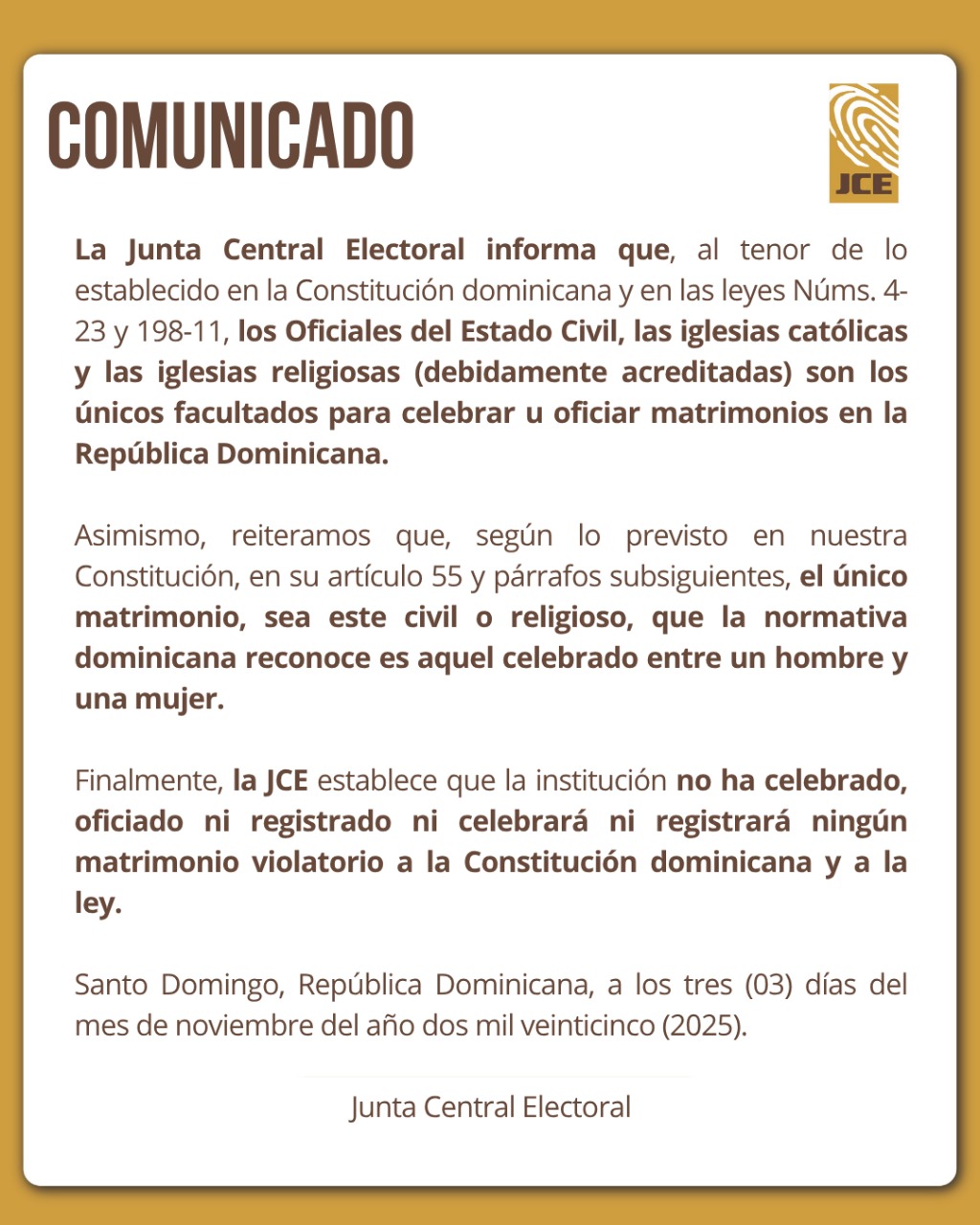 En un comunicado oficial, la institución subrayó que el único matrimonio reconocido por la Constitución de la República Dominicana, sea civil o religioso, es el celebrado entre un hombre y una mujer. Asimismo, reiteró que los únicos facultados para celebrar matrimonios en el territorio nacional son los oficiales del Estado Civil, las iglesias católicas y las entidades religiosas debidamente acreditadas ante la JCE.